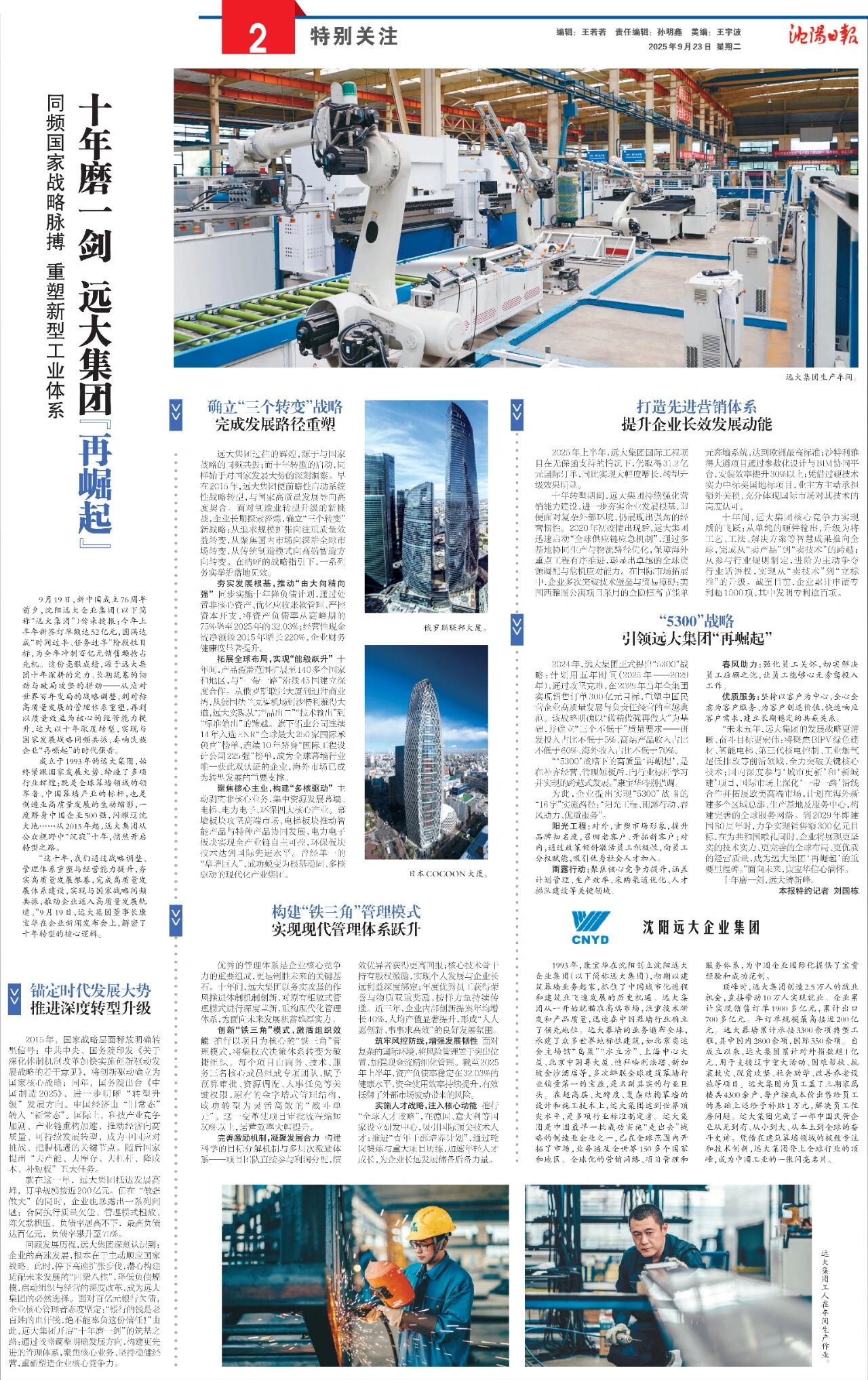 9月23日,《沈阳日报》重点报道了沈阳远大企业集团10年转型 “再崛起” 的实践成果。远大从负债率75%的困境中突围,十年磨一剑降至32.03%,更实现海外业务覆盖140多国的跃升,成为民营企业锚定国家战略、深耕主业的鲜活范例。