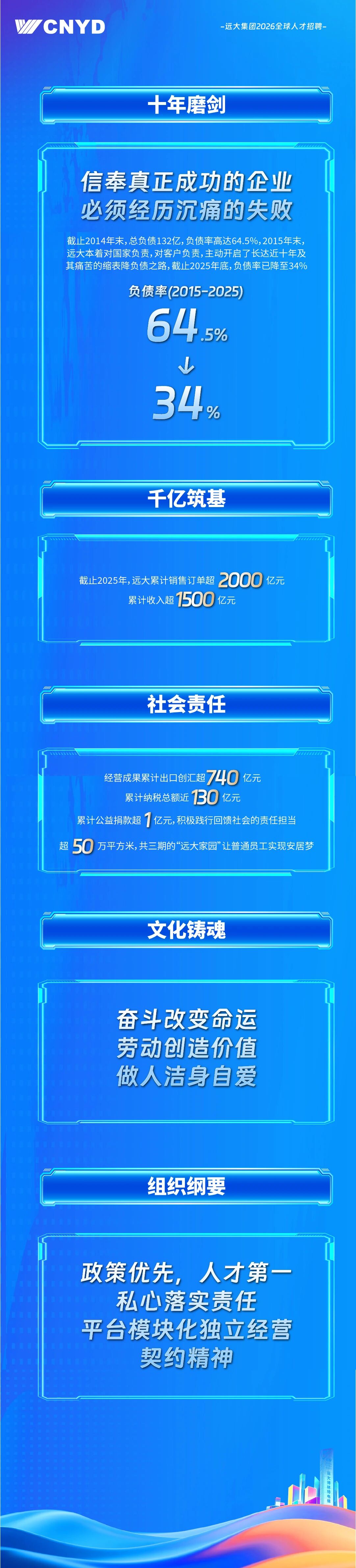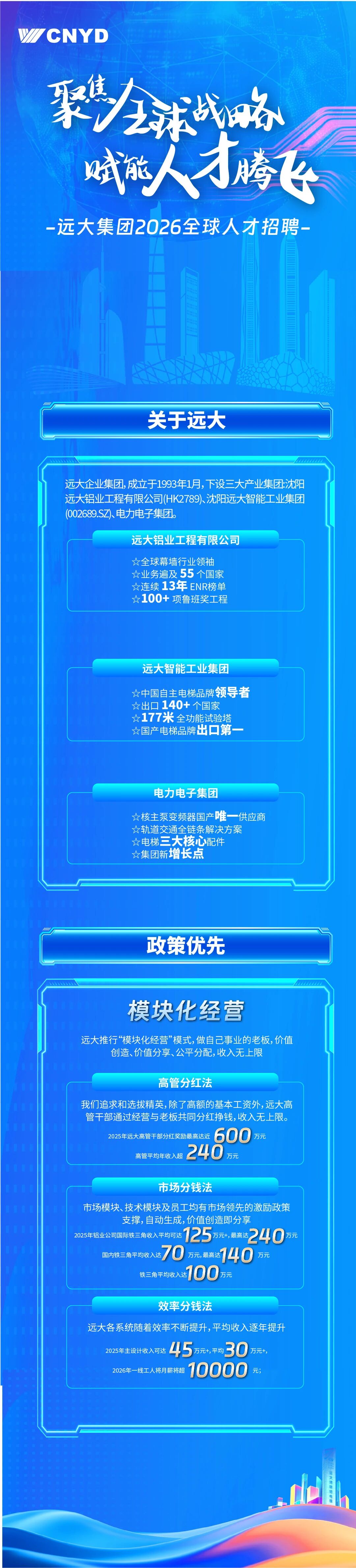 当行业在波动中寻找方向,远大铝业已着手拓展疆域。2026年,对远大铝业而言,不仅是一个时间刻度,更将是一个战略落地的“突破性增长”。业绩的再创新高,不仅是一个数字目标,更是技术人才、销售精英、优秀管理者智慧与实力的汇聚和创造。加入我们,您不仅是在选择一份职业,更是在从事一项意义深远的事业——用创新推动技术进步,用智慧赢得高额收入,用中国智造影响全球建筑行业发展。